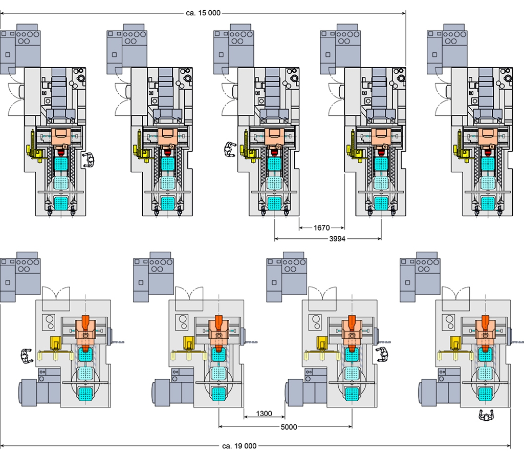 Die neue NBH 5 ist in der Grundausführung ohne Palettenwechsler für die manuelle, halb-automatische oder vollautomatisierte Direktbeladung in flexiblen und agilen Fertigungssystemen vorgesehen, wie sie in der Automobil- und Zulieferindustrie, aber auch vermehrt bei Nutzfahrzeug-, Hydraulik- und Industriegetriebeherstellern zum Einsatz kommen . Mit einem neuen Werkzeug-Kettenmagazin, im Standard mit 32 Werkzeugplätzen, lässt sich jetzt bei der NBH 5 eine Maschinenbreite von nur noch 2400 mm realisieren. Das sind gegenüber der bisherigen Maschine mit rund 3700 mm über einen Meter weniger. Die kompakte, platzsparende Späneentsorgung nach hinten ist ein weiteres Indiz für den prädestinierten Einsatz dieser Maschine in Zellen und Systemen. Um den globalen Marktanforderungen weiter gerecht zu werden, gibt es die neue NBH 5 nicht nur mit der aktuellsten Siemens Steuerung SINUMERIK 840D sl Operate, sondern auch mit der neuesten Fanuc Steuerung 0i F.
