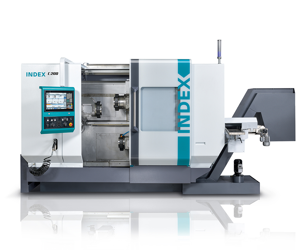 Die Drehautomaten INDEX C100 (Spindeldurchlass 42 mm) und C200 (Spindeldurchlass 65 / 90 mm) sind konsequent auf Produktivität getrimmt. Mit ihren zwei oder drei Revolvern eignen sich die beiden Maschinen selbst für anspruchsvolle Simultanbearbeitung. Für die erforderliche Leistung sorgen die baugleichen Haupt- und Gegenspindeln. Für hohe Dynamik sorgt auch der Gegenspindelschlitten, der im Eilgang bis zu 60 bzw. 50 m/min (C100 / C200) erreicht. Die schnelle Revolverschaltung trägt zudem zu kurzen Span-zu-Span-Zeiten bei.