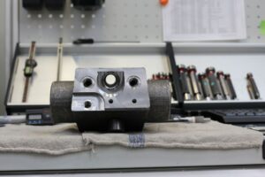 Diese Zuverlässigkeit ist auch bei der Herstellung von Komponenten aus Baustahl (St 52-3) für das Hydrauliksystem der Verschiebepresse in Abroll- und Absetzkippern ein Thema. MEILLER fertigt davon etwa 25.000 Stück pro Jahr in unterschiedlichen Varianten. In einem der zahlreichen Arbeitsschritte bringt das MEILLER-Team ein sogenanntes Zylinderauge ein. Die 120 Millimeter lange Stufenbohrung mit zunehmenden Durchmessern von 20, 22 und 25 Millimetern, nimmt später drei Dichtungen auf und muss eine hohe Oberflächengüte aufweisen.