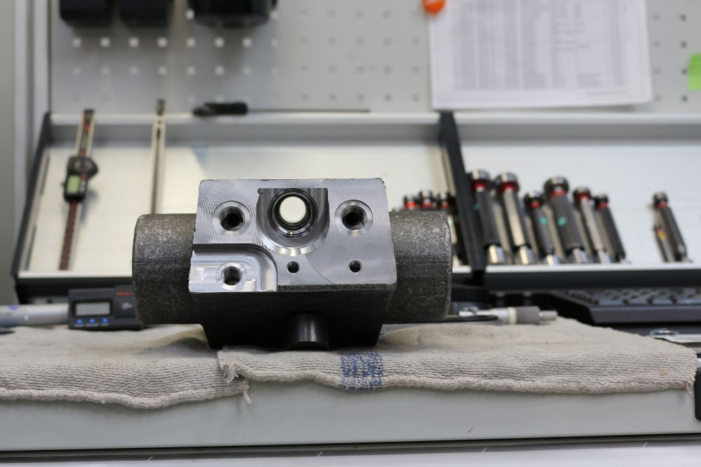 Wie gehabt, setzt der 18er-SUMOCHAM die 120 Millimeter tiefe Durchgangsbohrung, anschließend tritt das QUICK3CHAM-Trio in Aktion. Erst fährt der 20er in die Bohrung und weitet sie auf einer Strecke von 86 Millimetern. Ihm folgt der 22er, der 60,5 Millimeter tief bohrt, und schließlich der 25er für die 35 Millimeter. „Durch den umgedrehten Prozess reduzieren wir das Aufmaß und verringern den Schnittdruck“, sagt Patrick Muller. „Das erhöht die Oberflächenqualität der Bohrung und wir erreichen Rautiefen von unter 1,8 Mikrometern.“ Das schützt die Abstreiferlippen der später verbauten O-Ringe und verhindert, dass Undichtigkeiten entstehen.