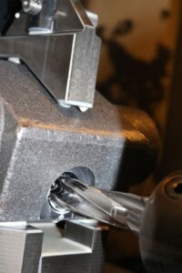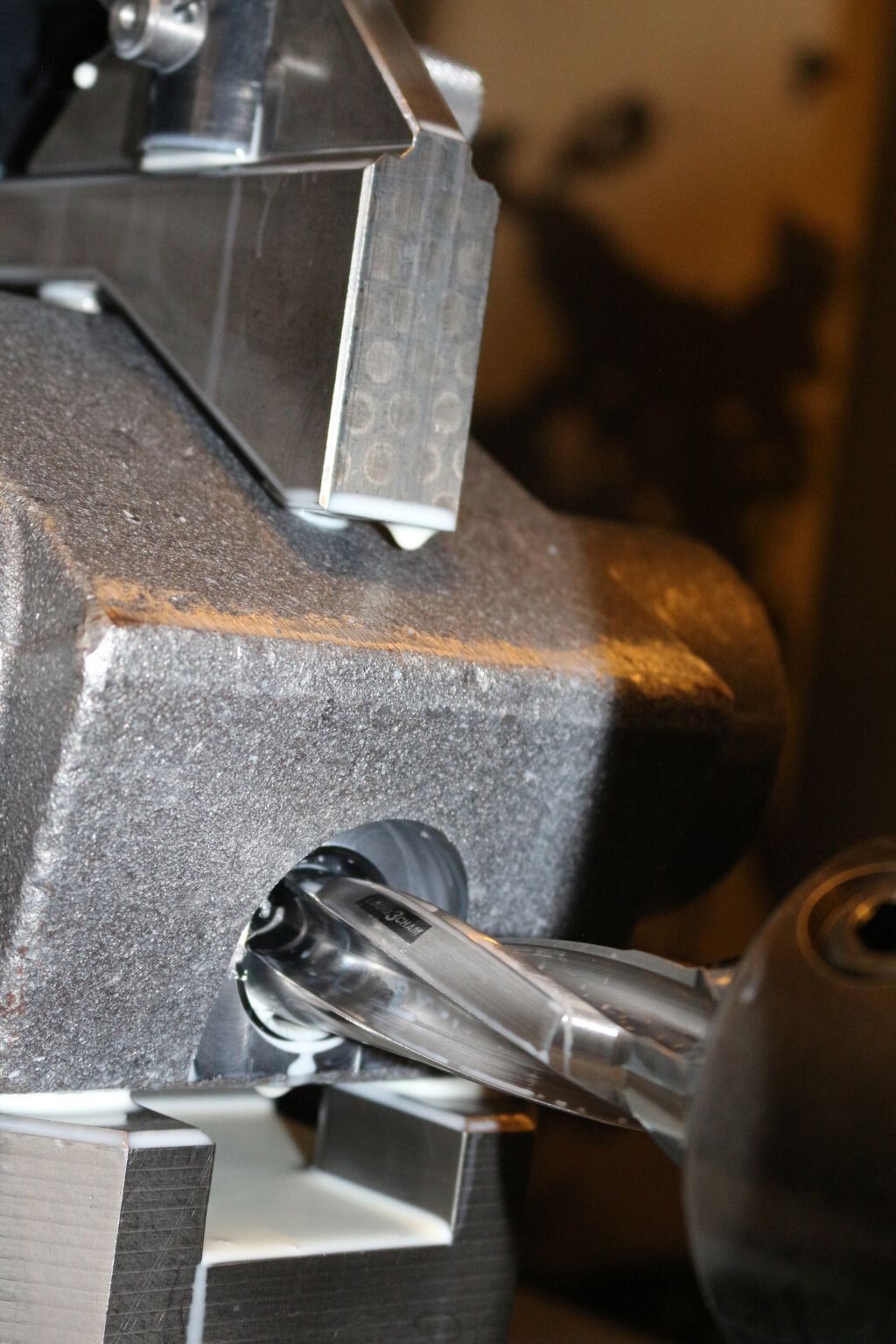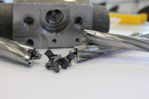 Die Testläufe in München waren erfolgreich, führten aber zu unerwarteten Ergebnissen. „Die Fluchtung der Bohrungen zueinander passten einwandfrei, aber wir hatten sehr lange und dicke Späne, was schlecht für die Spankontrolle, die Oberflächengüte und die nachfolgenden Reibeprozesse wäre“, sagt Dirk Moosreiner. „Deshalb haben wir entgegen aller Logik die Aufbohr-Reihenfolge umgedreht – und siehe da: kurze Späne in der gewünschten Dicke.“