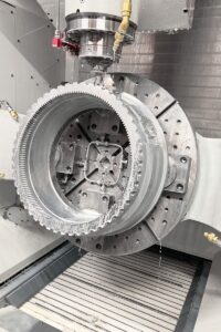 Die FZ 19 S five axis mit geöffnetem Arbeitsraum und Blick auf das in einem durchgängigen Prozess komplett bearbeitete Turbinengehäuse. Bild: Chiron