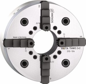Ein innovatives Spannkonzept für diese anspruchsvollen Anforderungen stellt SCHUNK nun mit dem neuen Kraftspannfutter ROTA THW3 2+2 zur Verfügung. Dieses 4-Backen-Drehfutter verfügt über zwei unabhängige Backenpaare mit einer anschließenden zentrisch ausgleichenden Werkstückspannung. Dadurch lassen sich Freiformteile, Gussteile oder geometrisch unbestimmte Werkstücke prozesssicher spannen. Dank der patentierten Abdichtung können Unternehmen dieses 2+2-Ausgleichsfutter unbesorgt in rauer Umgebung mit Schmutz und feinen Spänen einsetzen. Darüber hinaus profitieren Anwender gleichzeitig von konstanten Spannkräften und deutlich längeren Wartungsintervallen, was zu einer Steigerung der Produktivität bei gleichbleibender Qualität führt.