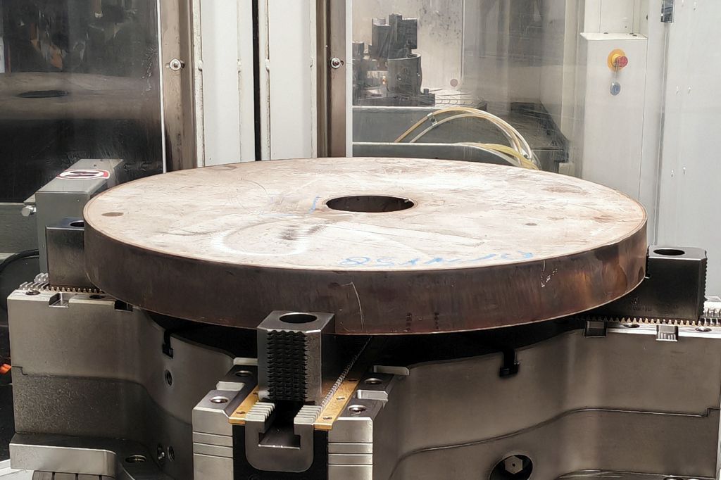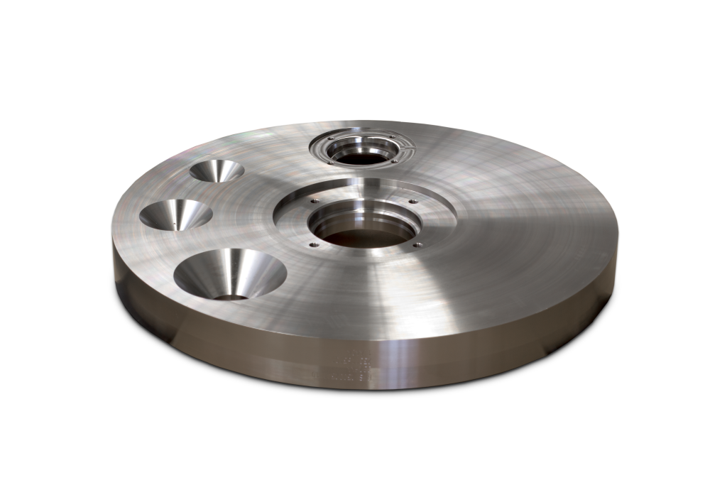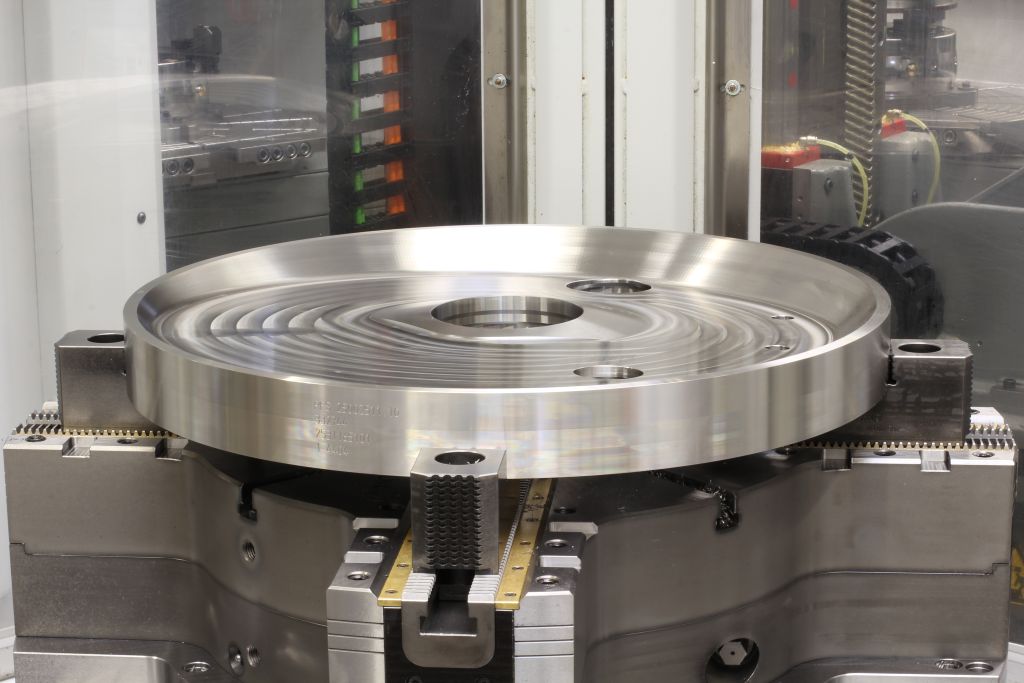 Die auf dem Dreh-Fräszentrum gefertigten Rohteile aus schwer zerspanbarem Edelstahl werden am externen Rüstplatz auf eine Palette montiert, die der Wechsler auf dem Rüstplatz positioniert hat. Beim Einwechseln der Palette gibt der Bediener das zum Rohling passende NC-Programm an. So füllt sich das Palettenlager und mit der Bearbeitung kann gestartet werden. Zuerst erfasst der Messtaster hierbei den Nullpunkt der Palette und die Maschine beginnt dann das NC-Programm abzuarbeiten. Beim genannten Kombinationsflansch dauert die Bearbeitung über 20 Stunden.