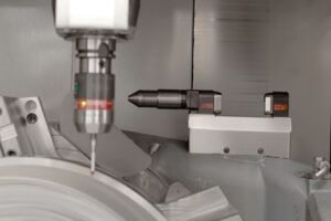 Alternativ bietet FormControl X die Möglichkeit, dass ein Werkzeug automatisch gegen ein Schwesterwerkzeug ausgetauscht wird, wenn der Verschleiß die vordefinierte Warngrenze überschreitet. Das ermöglicht die Einhaltung der Toleranzen auch im mannlosen Betrieb. Für die Werkzeugmessung und Überwachung ist in der Maschine das Lasermesssystem LC52-DIGILOG von BLUM installiert, mit dem sowohl Fräs- wie auch Drehwerkzeuge vermessen werden. So stellt Bott sowohl per Werkzeug- als auch Werkstückmessung sicher, dass die Zerspanungsprozesse zuverlässig durchlaufen.
