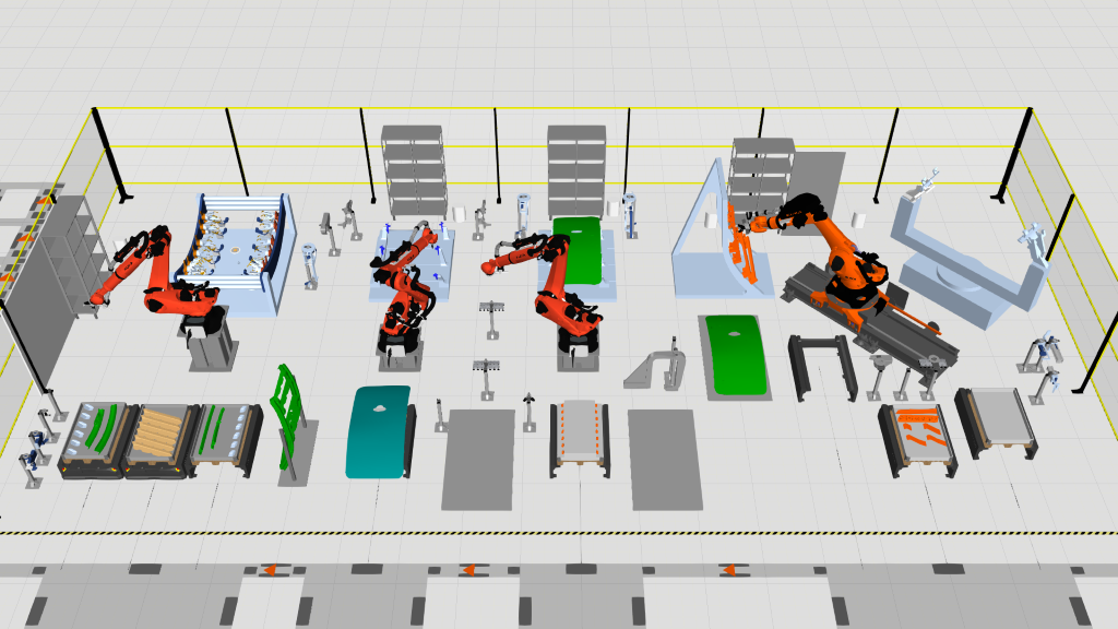 Die dynamische Kommissionierung hingegen verfolgt ein »Ware-zum-Roboter«-Prinzip und nutzt fahrerlose Transportsysteme (FTS) sowie ein anlagennahes Lager für hohe Flexibilität und Variantenvielfalt. Die Skalierung erfolgt durch einfache Erweiterung der Roboterzellen und FTS-Flotte, wobei der Staplerverkehr vollständig entkoppelt ist. Die Softwarelösung AutoLog, eine gemeinsame Entwicklung des Fraunhofer IWU und der Volkswagen AG, ermöglicht bei Volkswagen Slovakia die Konfiguration und Steuerung solcher Zellen im Self-Service und optimiert die Prozesse mit intelligenten Algorithmen. AutoLog erlaubt das initiale Design von Roboterzellen, steuert Roboter, Sicherheitstechnik und FTS, minimiert Wartezeiten und integriert Werkzeuge zur Fehleranalyse. Die virtuelle Inbetriebnahme erfolgt über eine Software-in-the-loop-Simulation zwischen AutoLog und einem Simulationsmodell in Siemens Plant Simulation. Dies ermöglicht die frühzeitige Bewertung neuer Anlagenkonfigurationen noch vor deren Betrieb.