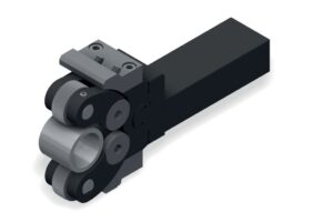 Der extrem stabile Sonderhalter aus der F761-Serie von QUICK mit Sonderrollen: Durch Werkstoffoptimierung, Wärmebehandlung und Anpassung der Zahnform wurden die Rändelrollen so optimiert, dass sie eine perfekte Rändelung auf dem extrem zugfesten Material erzielen können und gleichzeitig eine lange Standzeit haben. Bild: Hommel&Keller