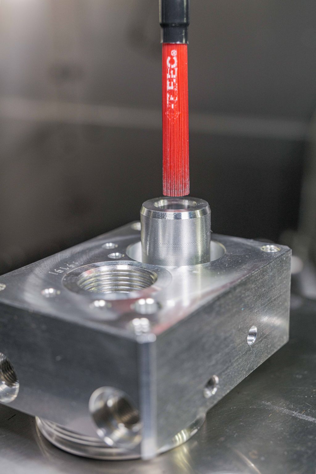 Als dritter Werkzeugtyp werden zwei Keramikfaser-Bürsten eingesetzt, um die Komplettentgratung des Bauteils zu garantieren. Die in ihren Vorteilen nicht zu übertreffenden Keramikfaser-Bürsten bestehen aus einzelnen Keramikfasern, die wiederum einen 80-prozentigen Anteil technischer Keramik (Al2O3-Aluminiumoxid) enthalten und nur 20 % Bindeanteil aufweisen. Diese Keramik eignet sich dann, wenn Werkstücke ein besonderes Oberflächenfinish benötigen oder wie in diesem Fall, keine Anhaftung stattfinden darf, die sich ggf. im späteren Ölkreislauf wieder lösen könnte. Die Oxidkeramik besitzt darüber hinaus eine hohe Härte (härter als Stahl), ist jedoch gleichzeitig so flexibel, dass sie sich der Werkstückoberfläche anpasst und somit eine gleichmäßige Schleifwirkung entsteht. Als letztes Werkzeug kommt eine zweite Keramikfaser-Bürste am Bohrungsaustritt im zylindrischen Absatz zum Einsatz. Ein kleiner Restgrat, der dort nach dem Bearbeiten entsteht, wird mit einer kleinen Oberflächenbürste rückstandslos entfernt.