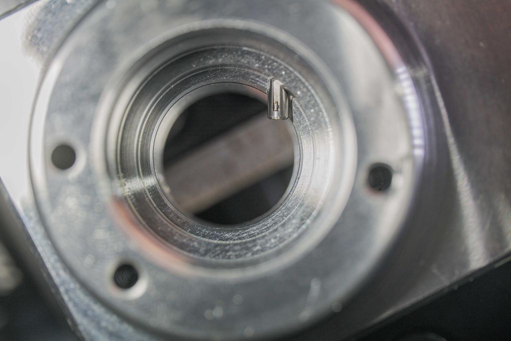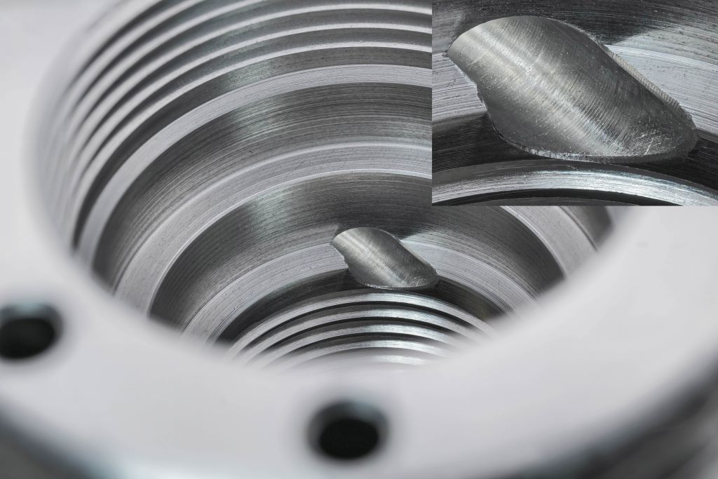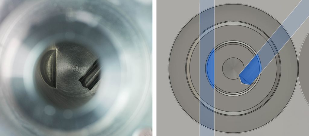 Linker Ausbruch auf der Bodenfläche: eine Tieflochbohrung schneidet halboffen die Bodenfläche. Diese wird mit dem HSD-Entgratwerkzeug durch die Tieflochbohrung prozesssicher entgratet. Rechter Ausbruch am Bohrungsgrund: die Tieflochbohrung endet halboffen in der Bodenfläche und im Freistich entsteht ein Grat, der nur durch den Einsatz der Keramikfaser Cross-Hole Bürste Typ BÜCHA127M entgratet werden kann. Unter Drehzahl spreizen sich bei diesem Bürsten-Typ die einzelnen Fasern durch die Fliehkraft auf und entfernen somit ‚sanft‘ entstehende Mikro-Grate. Bild: Kempf