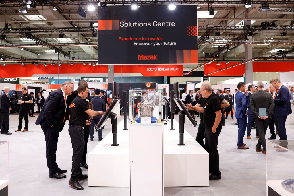 Zentraler Bestandteil des Messestands war das neue Mazak Solutions Center – ein Innovations-Hub für neueste Entwicklungen in den Bereichen Technologie, Konnektivität, Digitalisierung und MAZATROL Smooth CNC. Vorgestellt wurde unter anderem MAZATROL DX, ein digitales Tool zur schnellen Angebotserstellung auf Basis von Bearbeitungszeit und Stückkosten sowie zur Optimierung von Zykluszeiten und Materialeinsatz.