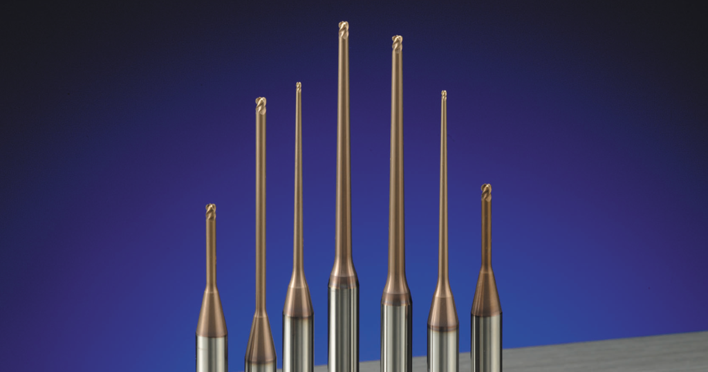 Die 4-schneidigen Rippenfräser aus der ETR/ETRP-Reihe sind im Durchmesserbereich von 1-3 mm und Nutzlängen von 3-50xD erhältlich. Die aufgetragene TH-Beschichtung ermöglicht die Bearbeitung gehärteter Stähle bis 65 HRC. Bild: Moldino