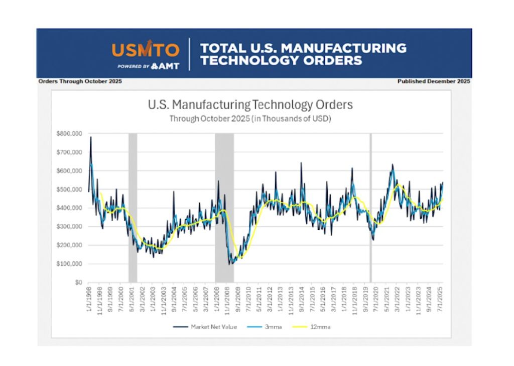 Die Auftragseingänge für Metallbearbeitungsmaschinen beliefen sich laut dem von AMT – The Association For Manufacturing Technology veröffentlichten U.S. Manufacturing Technology Orders Report im Oktober 2025 auf insgesamt 538,9 Millionen US-Dollar. Dies entspricht einem Anstieg von 9 % gegenüber September 2025 und einem Anstieg von 40,3 % gegenüber Oktober 2024. Die von USMTO bis Oktober 2025 erfassten Maschinenbestellungen beliefen sich auf insgesamt 4,47 Milliarden US-Dollar, was einem Anstieg von 19,7 % gegenüber den ersten 10 Monaten des Jahres 2024 entspricht.