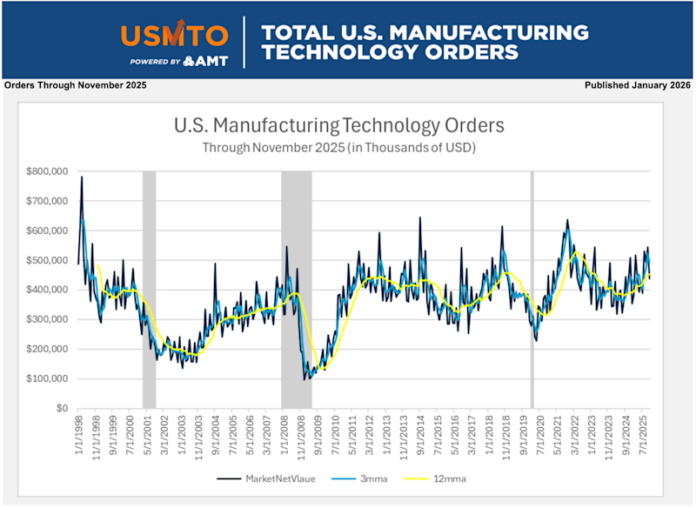Die Aufträge für Fertigungstechnologie steigen zum Jahresende tendenziell an, da Unternehmen versuchen, ihre Investitionsbudgets auszuschöpfen und Steuervorteile zu maximieren. Der November 2025 unterstrich diesen Trend und setzte gleichzeitig die seit August anhaltend hohe Auftragstätigkeit fort. Die Aufträge im November 2025 lagen fast 26 % über dem für November typischen Niveau, und mit Ausnahme des Vormonats verzeichnete der November den höchsten kumulierten Auftragswert seit Mai 2022.