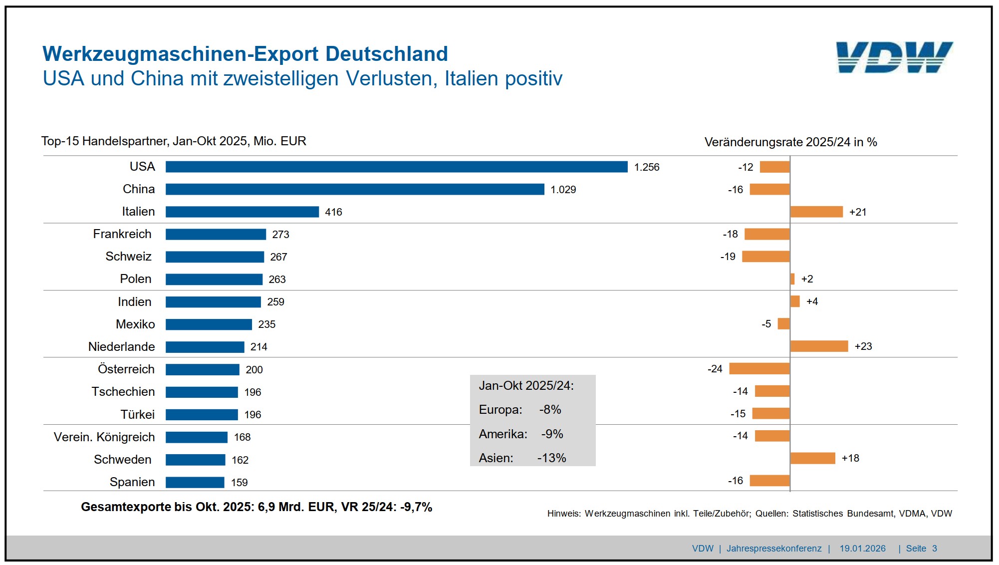 2025 gingen die deutschen Ausfuhren in die größten Absatzmärkte aufgrund der US-Zölle und des sinkenden chinesischen Imports kräftig zurück. Die Top-Absatzregion der deutschen Hersteller ist der Heimatmarkt Europa, der rund die Hälfte der Ausfuhren aufnimmt.