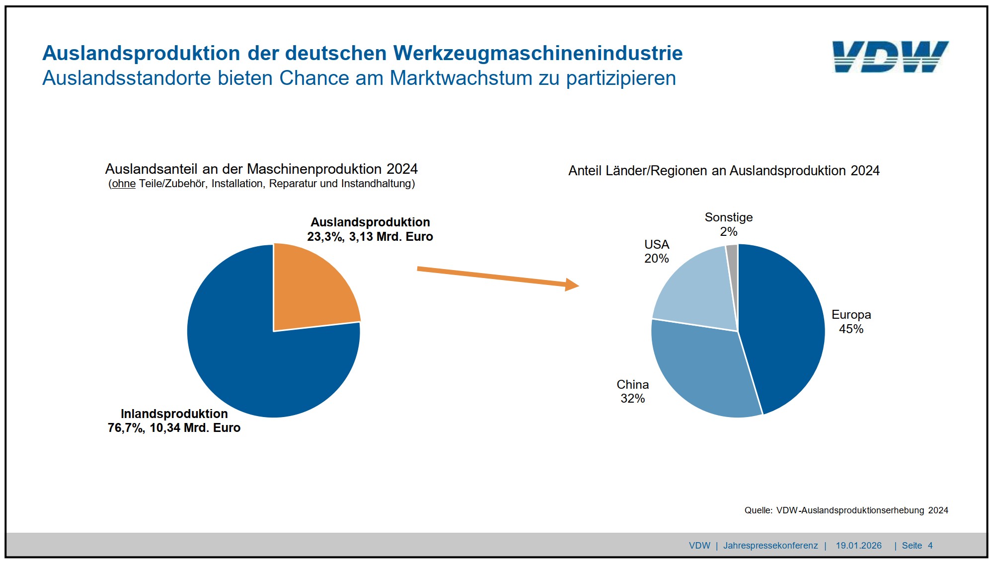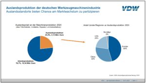 Zwölf größere Werkzeugmaschinenhersteller produzieren mittlerweile im Ausland. Ihre Auslandsproduktion steht für gut ein Fünftel der gesamten deutschen Werkzeugmaschinenproduktion. 45 Prozent werden in Europa erzielt, 32 Prozent in China und 20 Prozent in den USA.