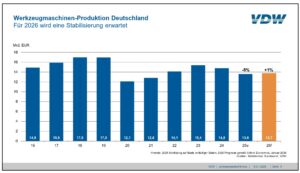 Die deutsche Werkzeugmaschinenindustrie erwartet nach zwei Jahren im Rückwärtsgang für 2026 einen Zuwachs in der Produktion von 1 Prozent auf 13,7 Mrd. Euro. „Wesentliche Grundlage dafür ist die erwartete Erholung der Inlandsnachfrage“, begründet Franz-Xaver Bernhard, Vorsitzender des VDW, auf der Jahrespressekonferenz die Prognose. Hohe Kosten, mangelnde Planungssicherheit und das Ausbleiben wirtschaftlicher Reformen zur Stärkung des deutschen Produktionsstandorts hatten die Investitionen im Vorjahr ausgebremst. Nunmehr würden positive Effekte des so genannten Sondervermögens der Bundesregierung erwartet, das in Infrastruktur, Verteidigung, Klimaschutz, Digitalisierung und Mobilität investiert werden soll und zumindest einen kleinen Impuls geben könnte.