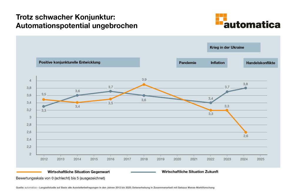 Gegenwärtige wirtschaftliche Lage wird seit 2018 zunehmend kritischer bewertet. Die Zukunftserwartungen der automatica-Aussteller sind auf anhaltend hohem Niveau