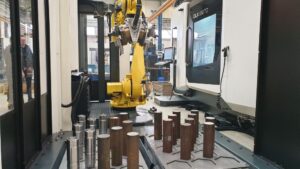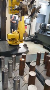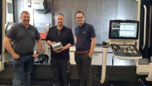 An sämtlichen Maschinen stehen Roboter. Trotz verhältnismäßig niedrigen Stückzahlen lohnt sich wegen der langen Laufzeiten die Automatisierung, wie Sebastian Reith erläutert: „Auf den Maschinen können wir unsere Produkte komplett fertig fertigen, also im Idealfall Rohteil rein, Fertigteil raus. Da kommen bei zehn Bauteilen schon mal fünf Stunden Laufzeit zusammen. Das ist dann eine Spätschicht.“ Der Arbeitsablauf sieht so aus, dass die zehn Mitarbeiter morgens Einzelteile herstellen und gegen Abend noch ein Teil pro Maschine einfahren. Den Rest besorgen dann Roboter in der mannlosen Spät- und Nachtschicht.