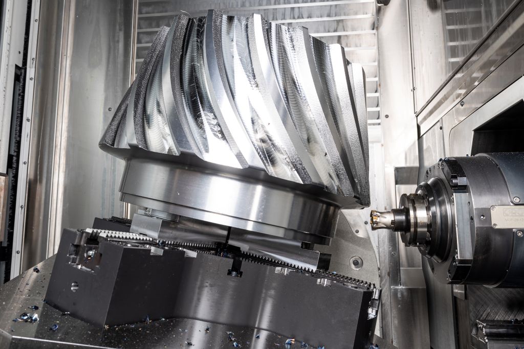Die Kraftübertragung von Motor zum Propeller geschieht in der mechanischen Variante über ein Kegelradgetriebe. Je nach Größe des VSP, gestalten sich auch die Ausmaße der Verzahnungsbauteile. Aufgrund der teils langen Bearbeitungszeiten sucht Glaser stets nach Punkten, wie er die Bearbeitungsprozesse optimieren kann: „Die Fertigung eines Kegelritzel mit dem Modul 21,4 erforderte eine Anpassung. Für die Vorbearbeitung des Ritzels benötigten wir auf einer speziellen Schälmaschine eine sehr lange Bearbeitungszeit“.