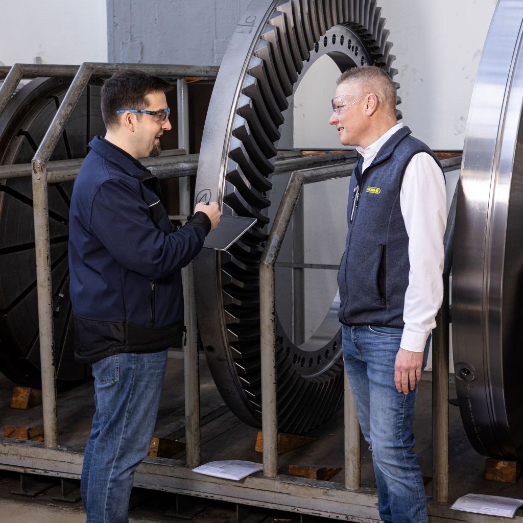 Dr. Thomas Glaser im Gespräch mit dem Horn-Außendienstmitarbeiter Stephan Weiß. Im Hintergrund steht das passende Tellerrad zu dem gefrästen Ritzel. Quelle: HORN/Sauermann