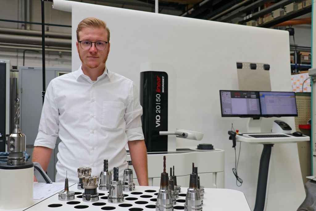 Oliver Oberkoch, der bei BERG auch für die digitale Werkzeugverwaltung und Koordination der Werkzeugvoreinstellung zuständig ist, erwähnt die grundsätzlichen Vorteile einer Werkzeugvoreinstellung: „Da beim Einwechseln des Werkzeugs in die Maschine die exakten Werkzeugdaten vorliegen, reduzieren wir die Maschinenstillstandzeiten, steigern die Präzision und verringern Nacharbeiten und Ausschuss. Wir erhalten konstante und wiederholbare Prozesse.“ Und er fügt hinzu: „Ideal ist es, wenn das Voreinstellgerät die Soll-Daten auf direktem Weg aus dem Werkzeugmanagement- beziehungsweise aus dem CAM-System erhält und die gemessenen Ist-Daten dann auch digital zur Maschine transferieren kann. Genau das schaffen wir mit unserem neuen HAIMER Microset Voreinstellgerät VIO linear.“