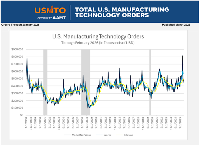 Die Auftragseingänge für Metallbearbeitungsmaschinen beliefen sich im Februar 2026 laut dem von AMT – The Association For Manufacturing Technology veröffentlichten „U.S. Manufacturing Technology Orders Report“ auf insgesamt 488,9 Millionen US-Dollar. Der Wert der Aufträge für Fertigungstechnologie stieg gegenüber Januar 2026 um 10,7 % und gegenüber Februar 2025 um 27,4 %. Der Gesamtwert der Aufträge für 2026 bis einschließlich Februar hat 930,5 Millionen US-Dollar erreicht und liegt damit 26 % über dem Wert der ersten beiden Monate des Jahres 2025.