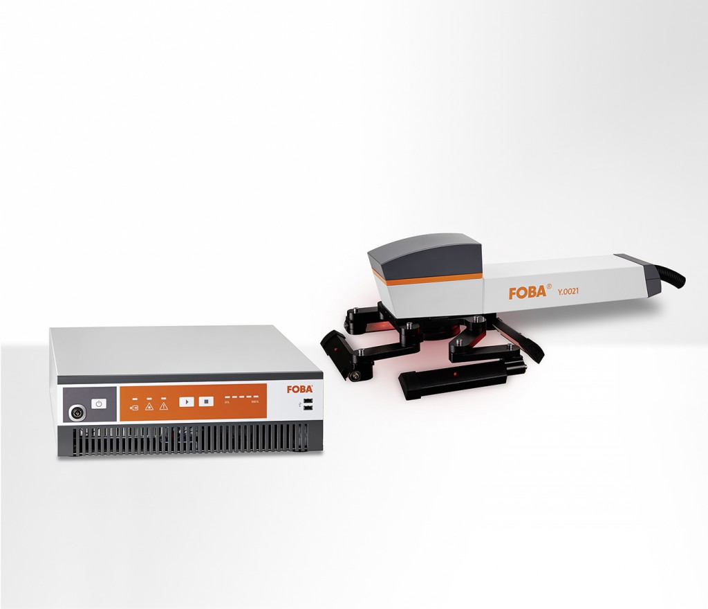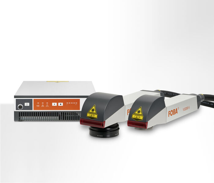 Markiereinheit und Markierköpfe des FOBA Y.0200-S Faserlasersystems, das sowohl mit null oder mit 90 Grad Laserstrahl-Ausfallwinkel verfügbar ist.