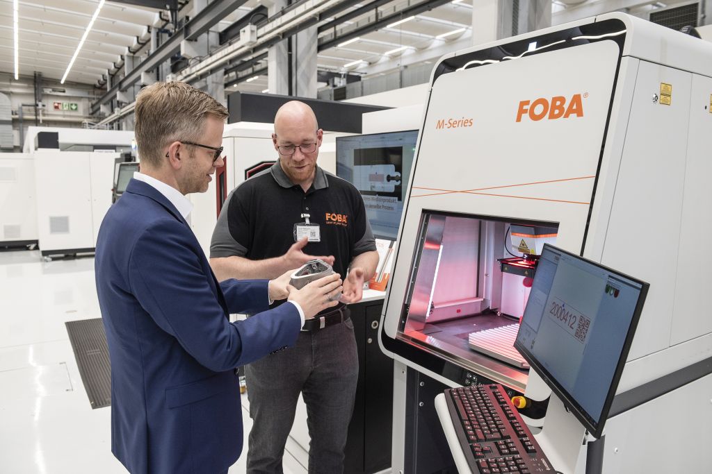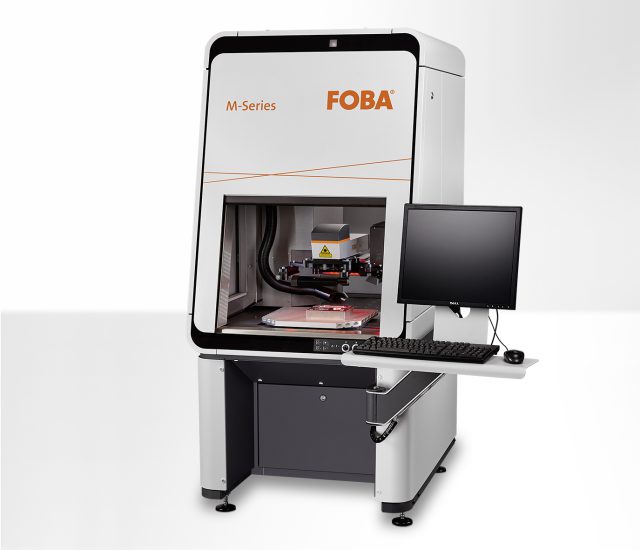 Zwei Lasermarkierstationen der FOBA M-Serie, M2000 mit FOBA Mosaic und M1000, ausgerüstet mit einer Dreheinheit, stehen auf der Messe IMTS für Mustermarkierungen zur Verfügung. (Bildnachweis: FOBA)