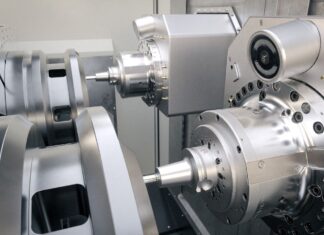 DMG MORI hat das neue DMU/C 55 H Twin Horizontalbearbeitungszentrum mit zwei Spindeln und Tischen vorgestellt.