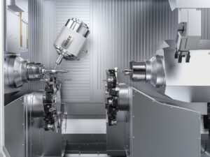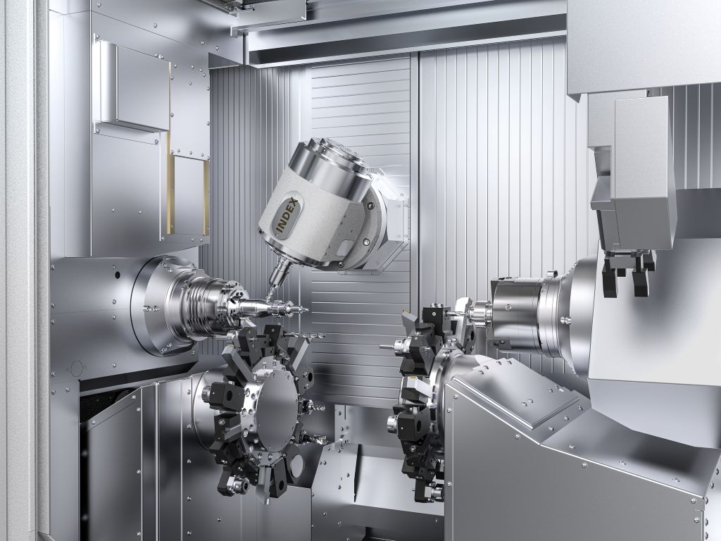 It uses the newly developed tool magazine for the INDEX G160. This is a tower magazine with 60 or 90 tools. A double gripper automatically changes the tools into the milling spindle.
