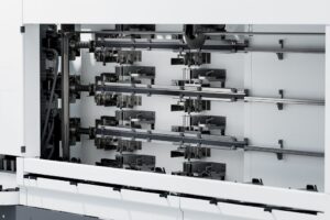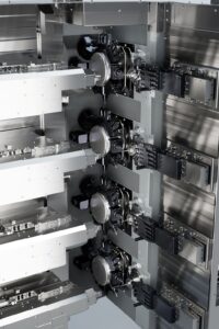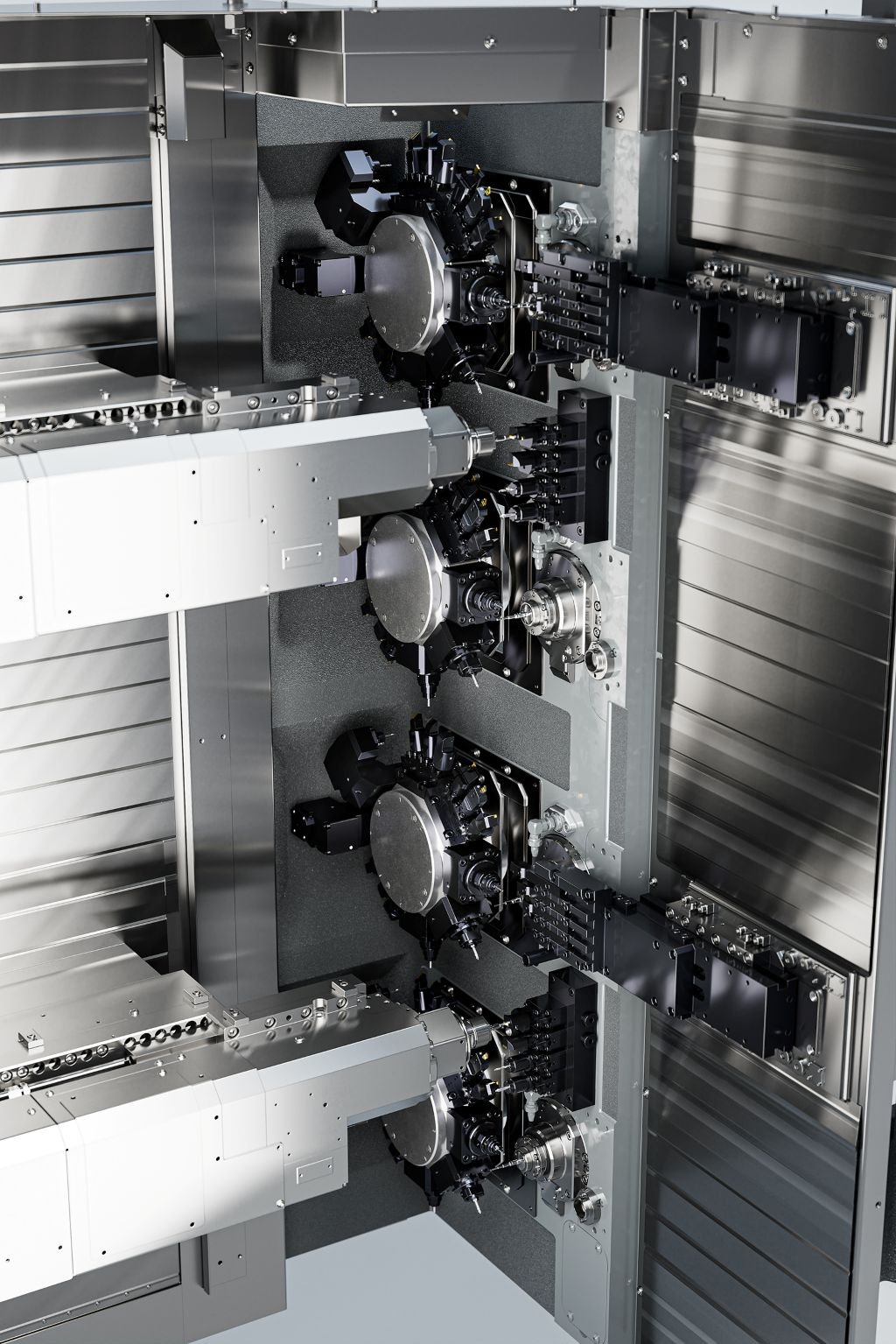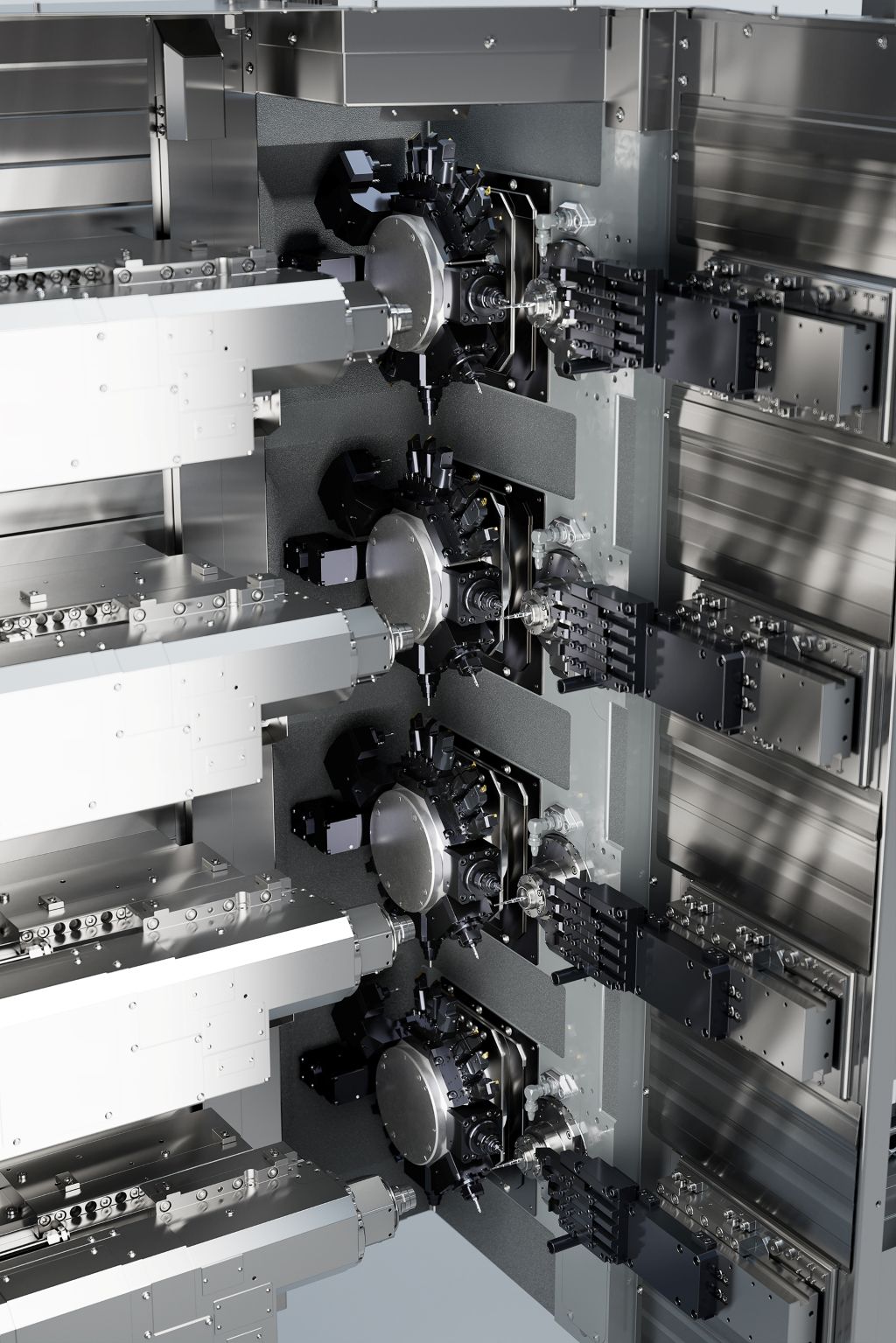 Головні шпинделі з інтегрованою Z-вісью дозволяють виготовлення за коротким або довгим токарним методом. Інструментальні револьвери оснащені X-вісью, інтерпольованою Y-вісью та, за бажанням, Z-вісью. До чотирьох протишпинделів і до чотирьох гнучких інструментальних тримачів оснащені лінійною 3-осьовою системою XYZ. Таким чином, всі інструментальні тримачі та протишпиндель можуть коригуватися в X, Y та Z. Керування здійснює нова розроблена система керування Mitsubishi з подвійною NCU.